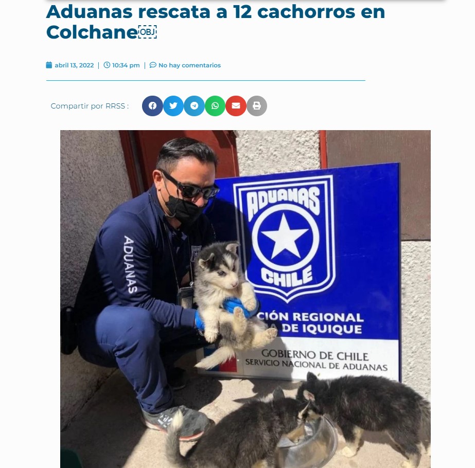 Estás en : Inicio / ADUANA INFORMA / ADUANA EN LA PRENSA El Longino: Aduanas rescata a 12 cachorros en Colchane Jueves 14 de abril de 2022 Artículos relacionados Aduana detecta contrabando de dinero... 24 Horas: #Informe24 Detalles de la... CHV: Aduanas ya tiene test para... [Las Últimas Noticias]: Chile le... [TVN Red Valparaíso]: Ministro Marcel...